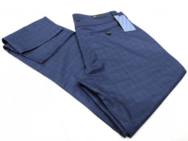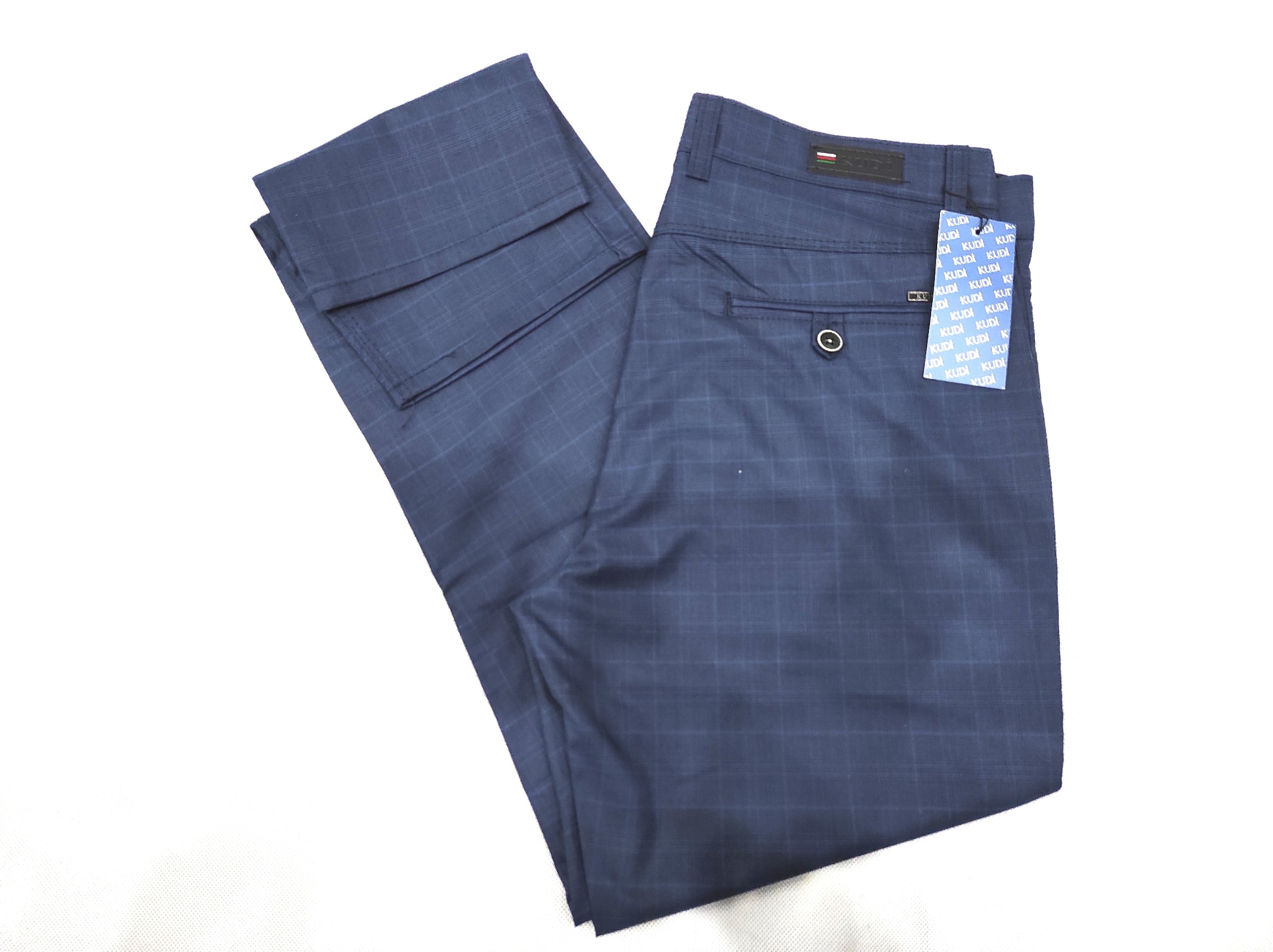 Spodnie męskie Kudi delikatna krata granatowa. Slimowany krój spodni bez wątpienia fantastycznie układa się na męskiej sylwetce. W rzeczywistości kolor spodni jest dużo żywszy.(W zależności od ustawień monitora kolor spodni może nieznacznie odbiegać od koloru rzeczywistego )