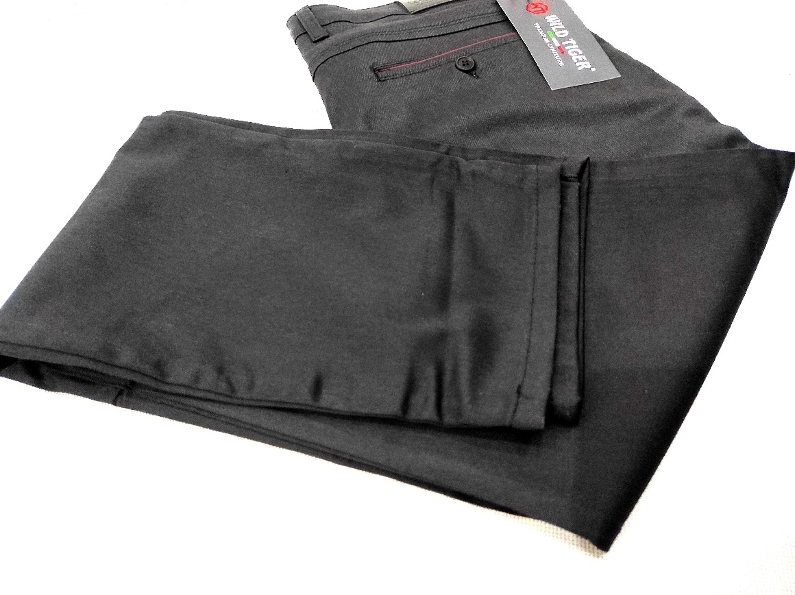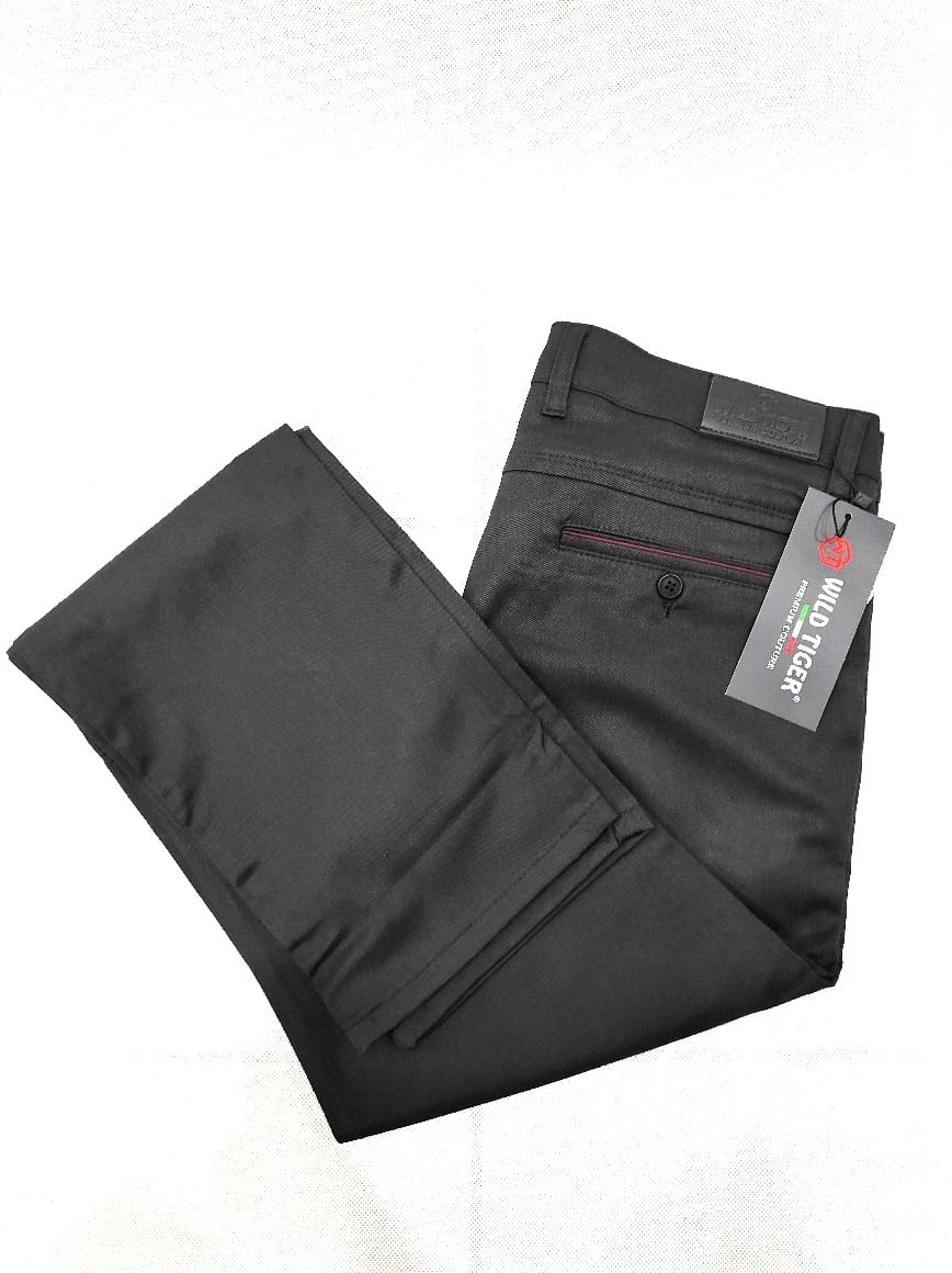 Spodnie Wild Tiger czarne, posiadające połysk. Slimowany krój spodni bez wątpienia fantastycznie układa się na męskiej sylwetce. W rzeczywistości kolor spodni jest dużo żywszy.(W zależności od ustawień monitora kolor spodni może nieznacznie odbiegać od koloru rzeczywistego )
