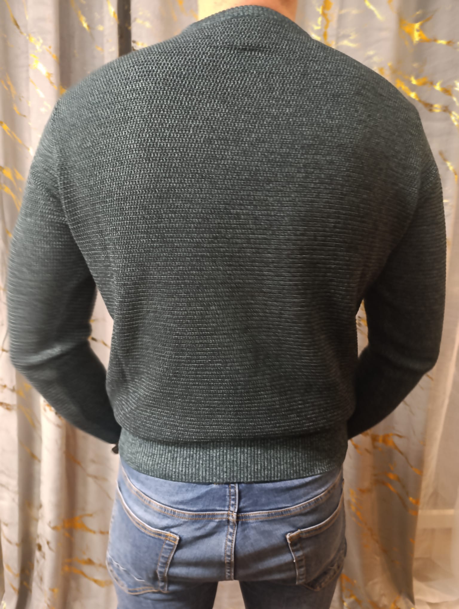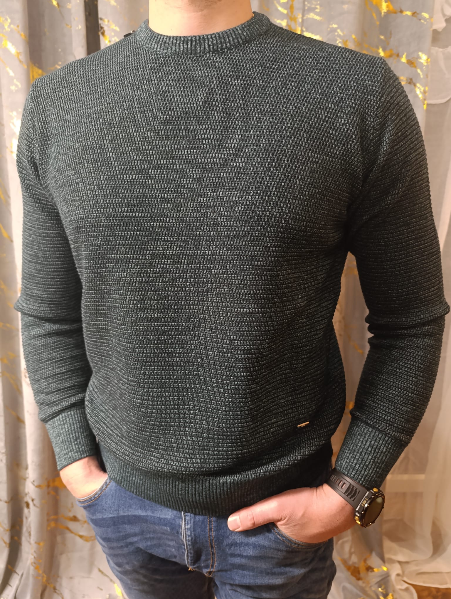 Sweter zielony z okrągłym dekoltem, uszyty w fasonie Slim Fit. Miękki i przyjemny do ciała materiał, który nie mechaci się i nie rozciąga. Klasyczny,wełniany. Najwyższa jakość wykonania. Bez wątpienia świetnie sprawdza się w chłodne miesiące, przede wszystkim znakomicie się układa. Dodatkowo dopasowuje do każdej sylwetki. Doskonały do większości stylizacji. Wykończony sciągaczem na dole oraz przy rękawach.