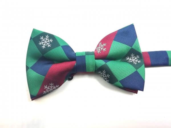 Unikatowa mucha męska świąteczna w kratę w białe śnieżki.