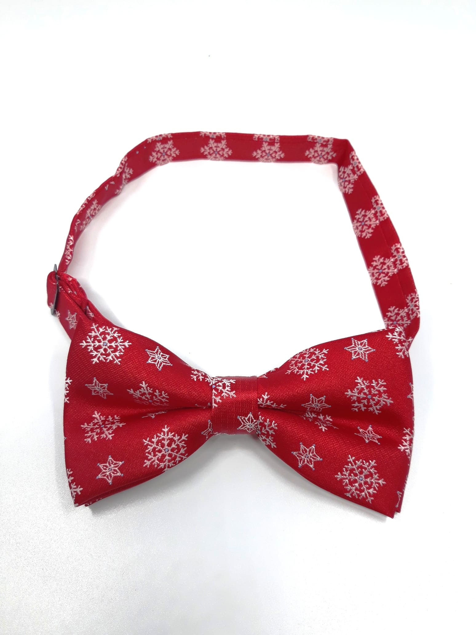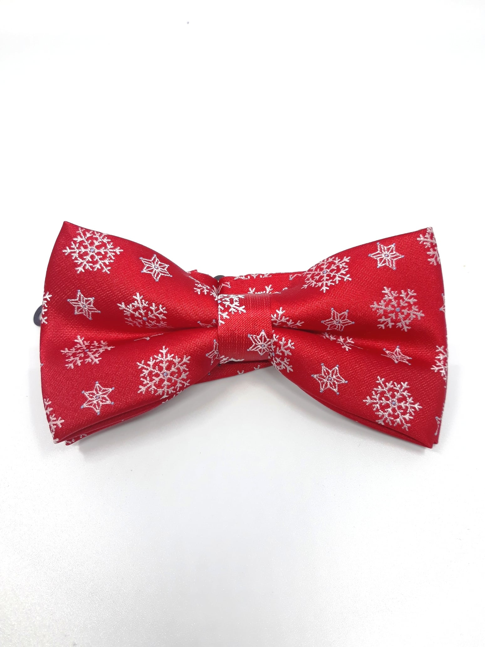 Unikatowa mucha męska świąteczna w kolorze czerwonym w białe gwiazdki śniegu.