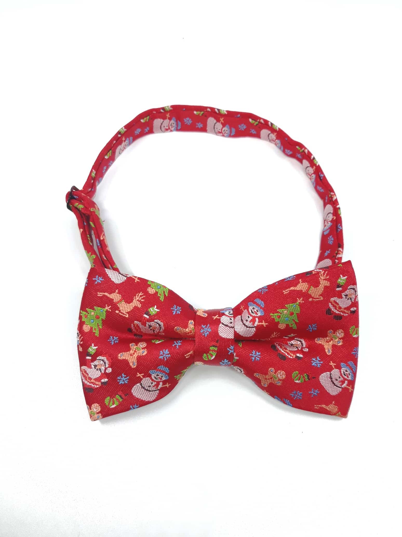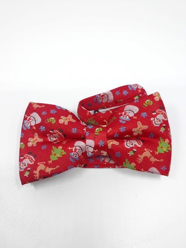 Unikatowa mucha męska świąteczna w kolorze czerwonym z akcentami świąt: bałwanki,Mikołaje,ciastka,choinki.