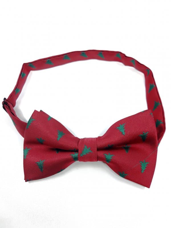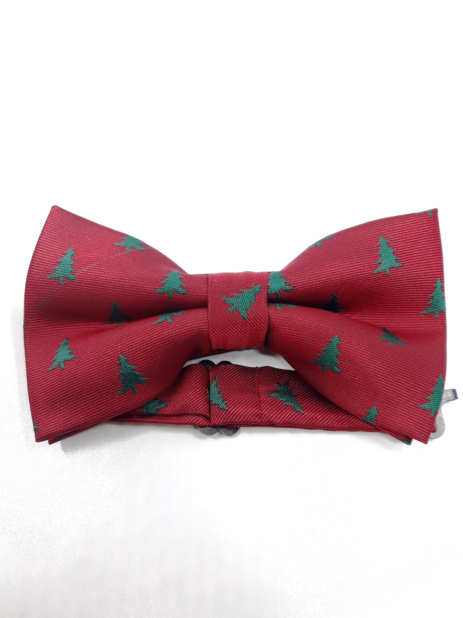 Unikatowa mucha męska świąteczna w kolorze bordowym z akcentem zielonych choinek.