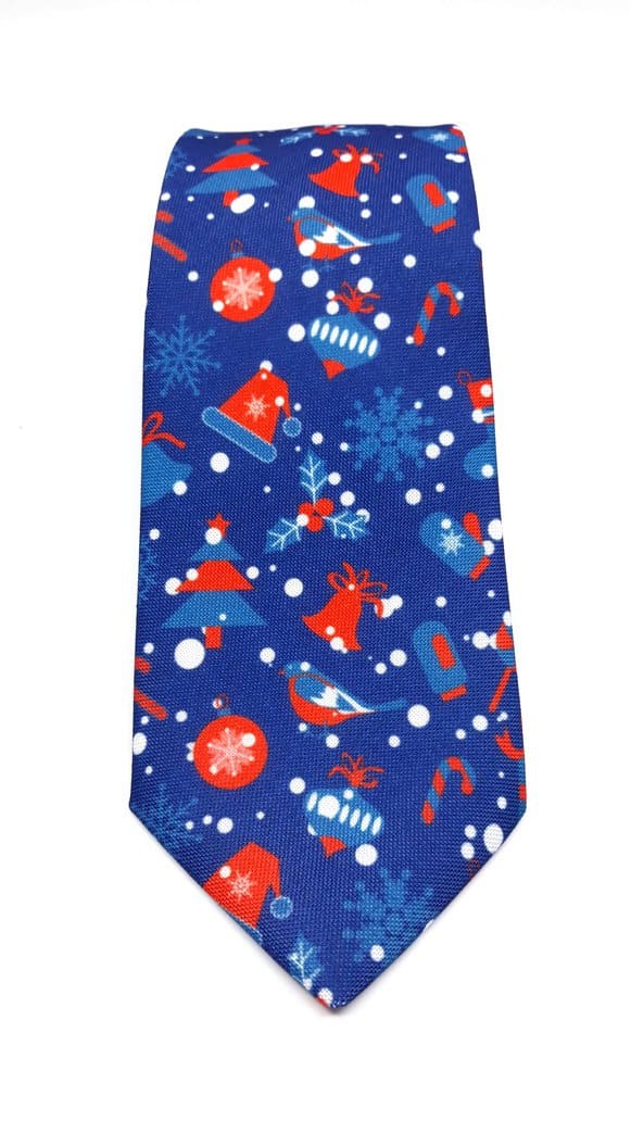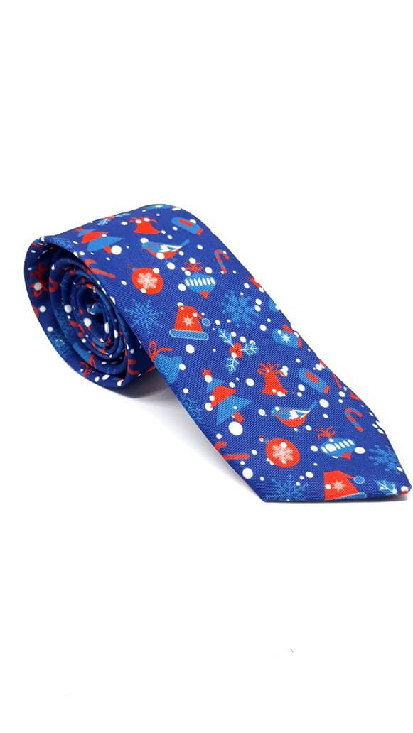 Świąteczny elegancki krawat męski w ciekawy wzór symboli świątecznych na niebieskim tle.
