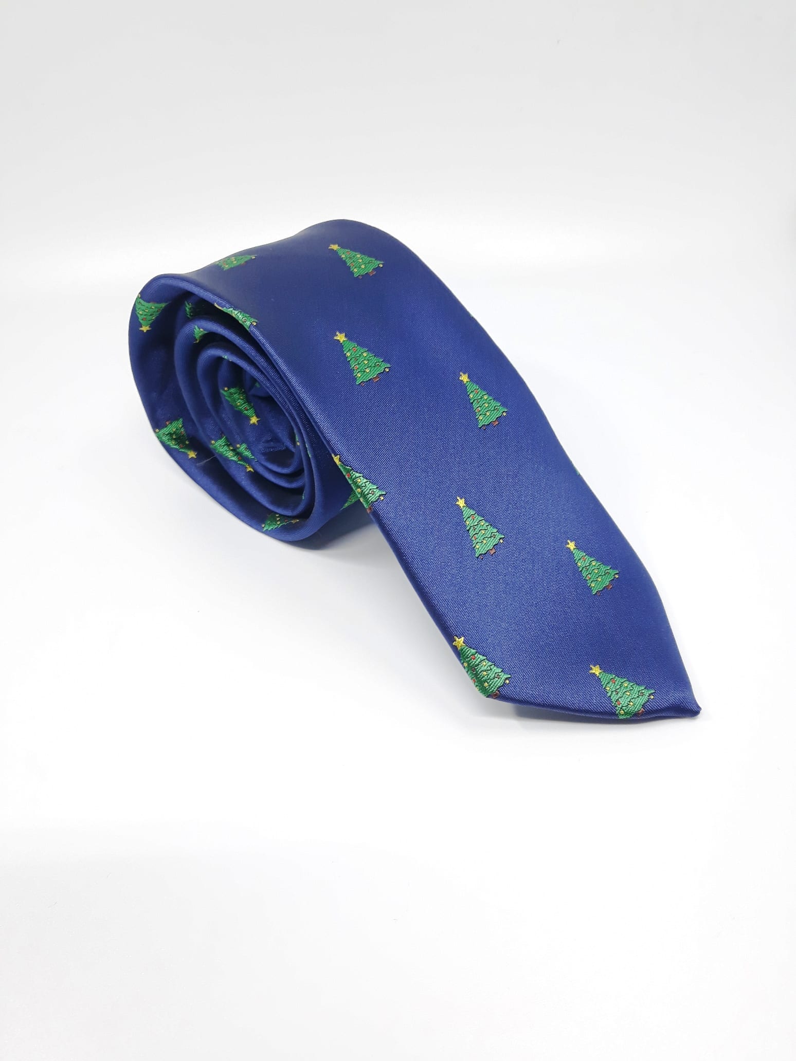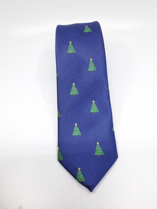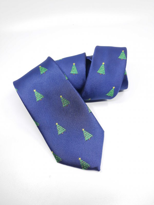 Świąteczny elegancki krawat męski w ciekawy wzór choinek na granatowym tle.