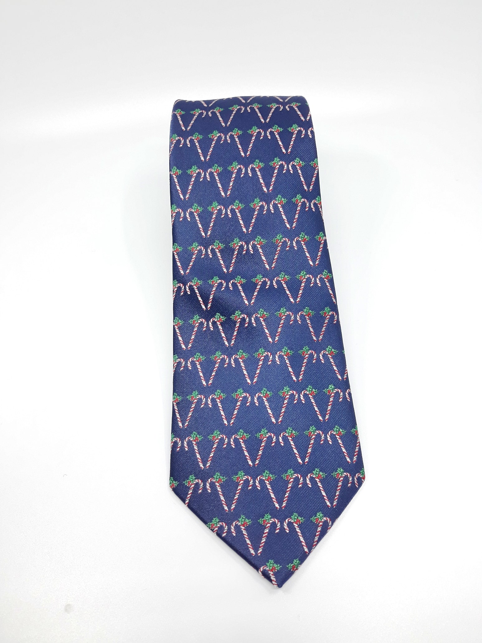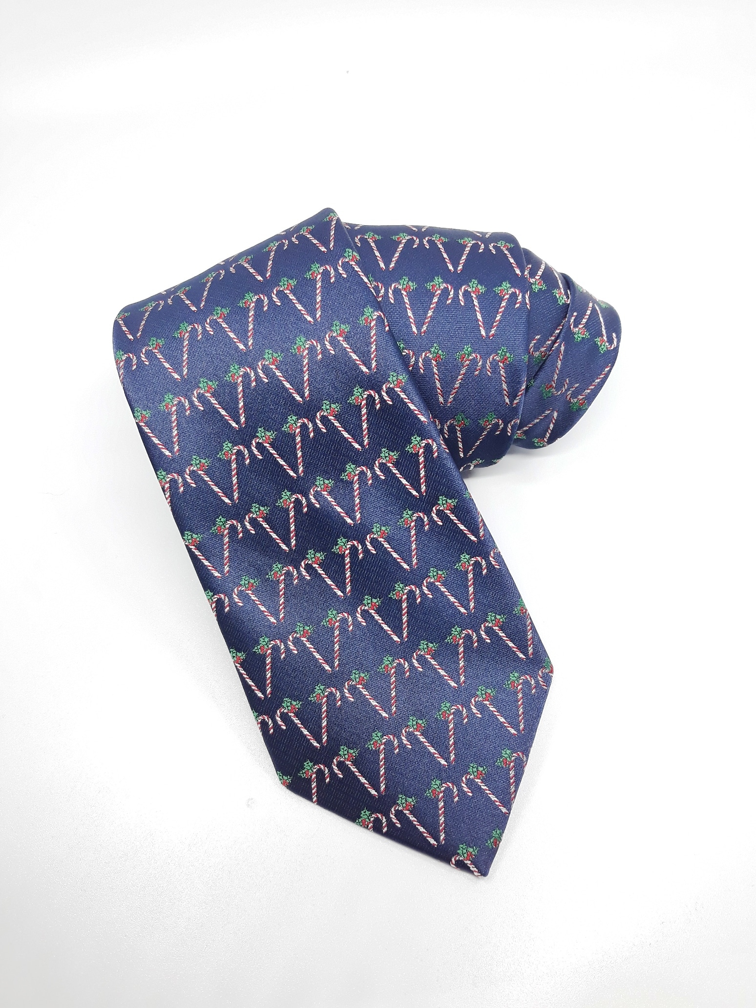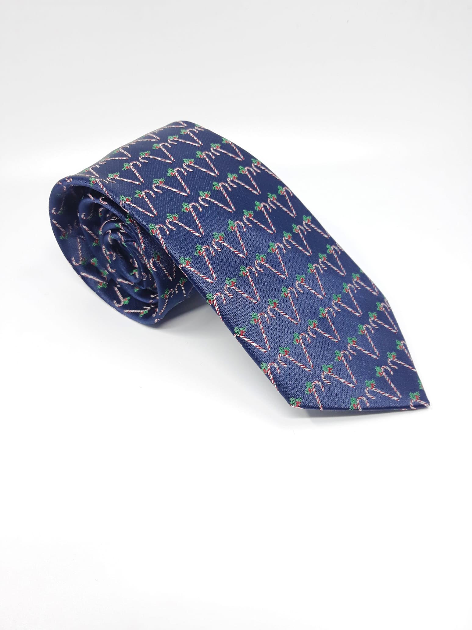 Świąteczny elegancki krawat męski w ciekawy wzór Mikołajkowych lasek na granatowym tle.
