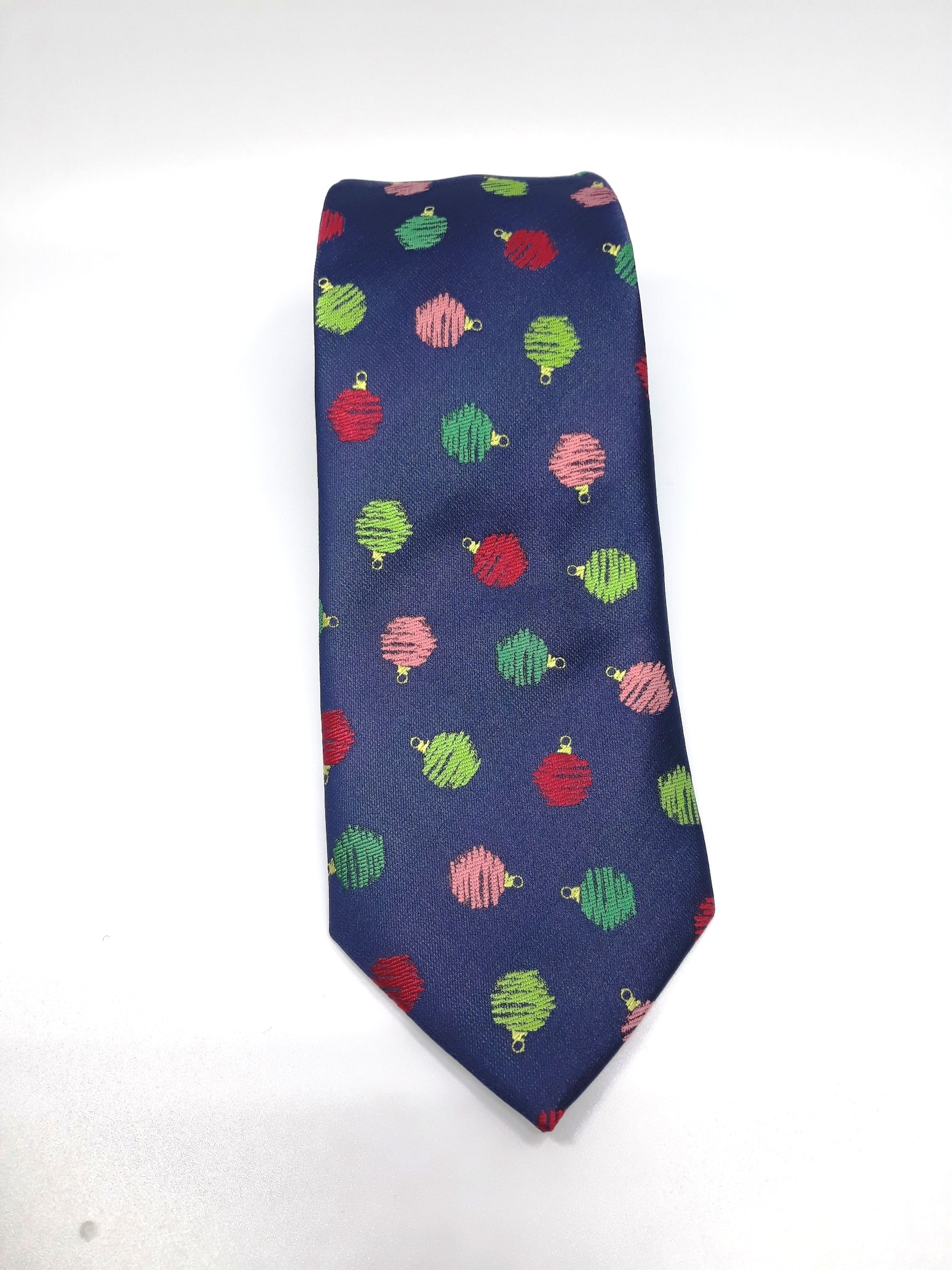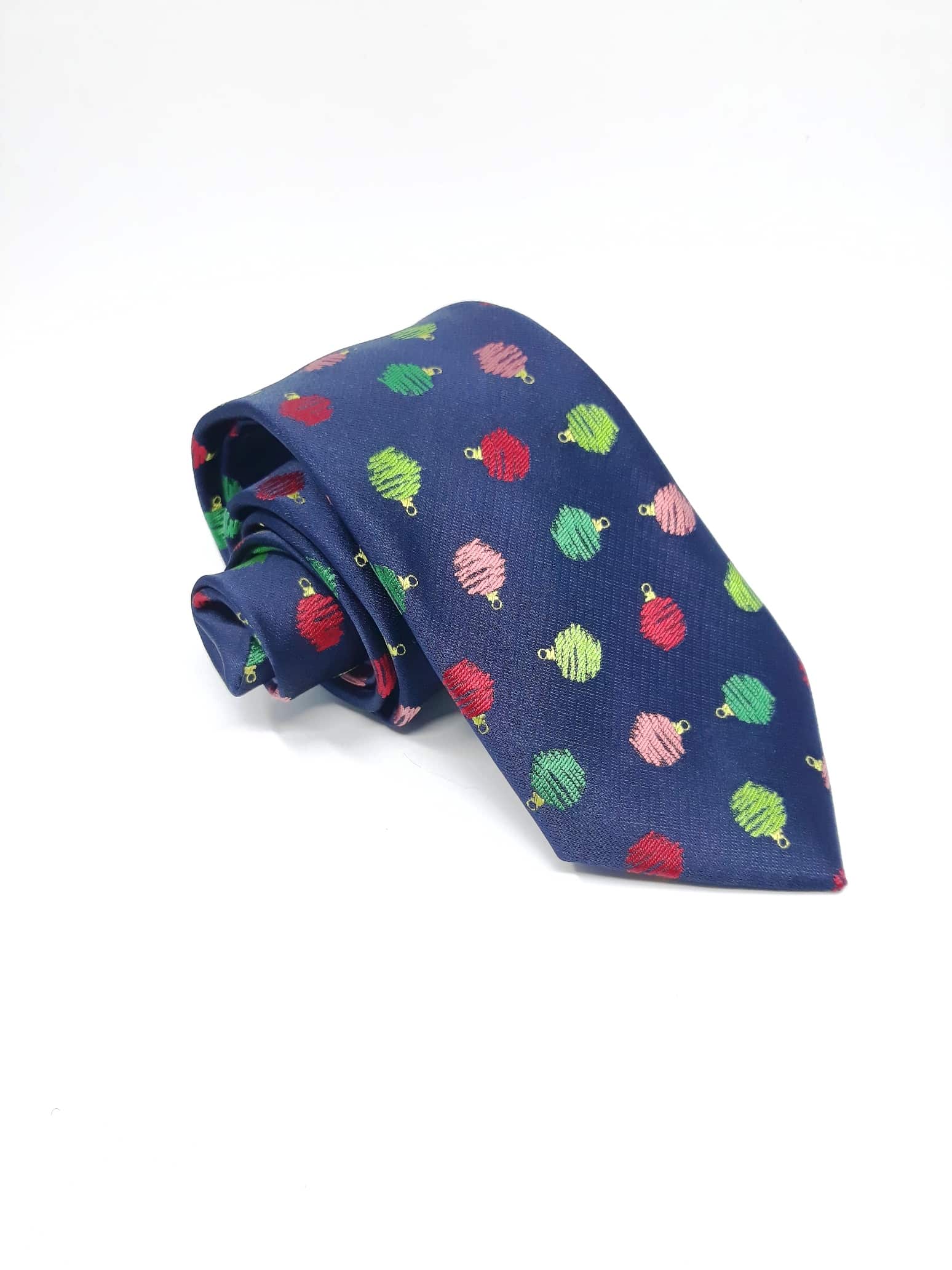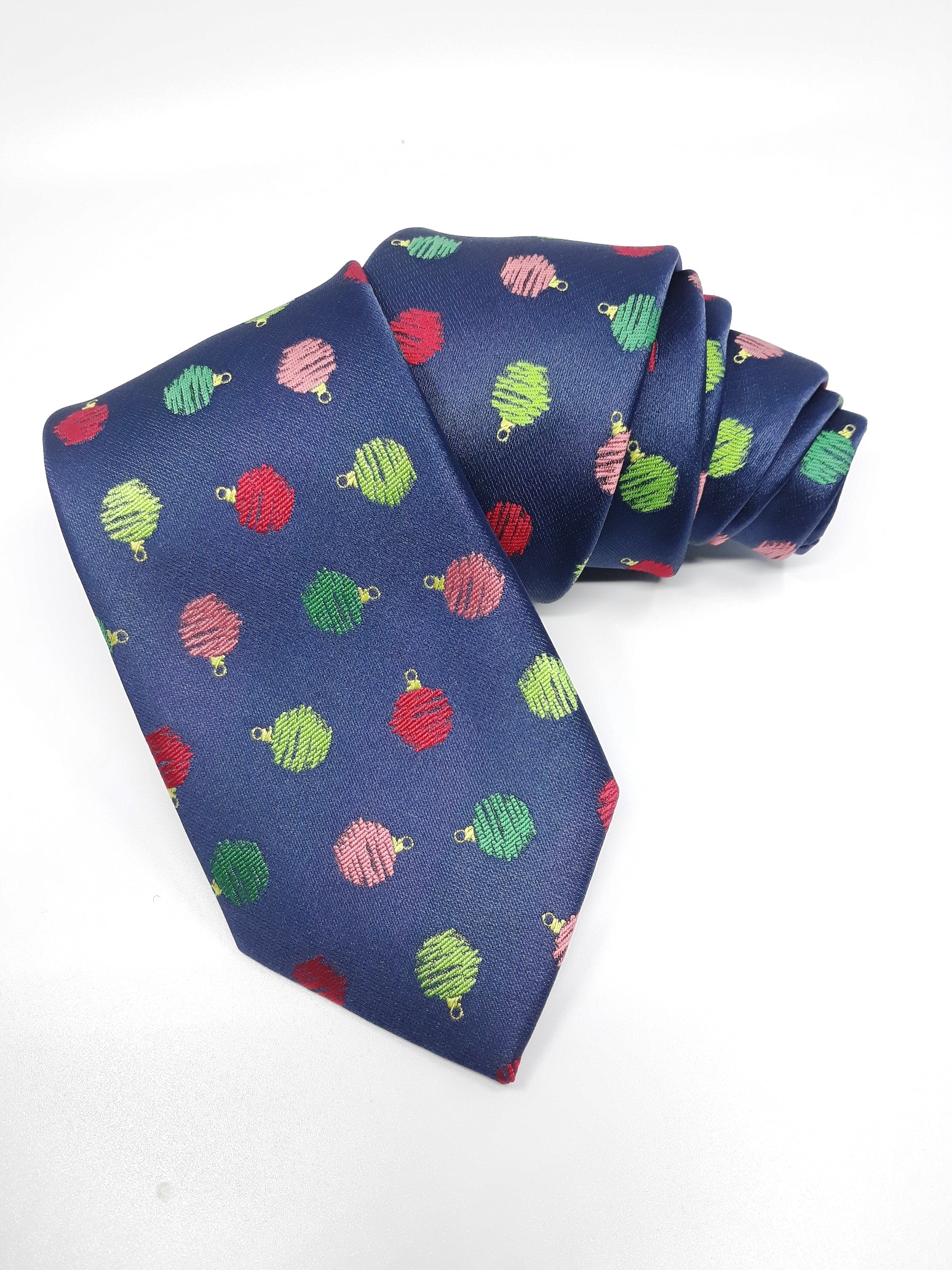 Świąteczny elegancki krawat męski w ciekawy wzór bombek na granatowym tle.