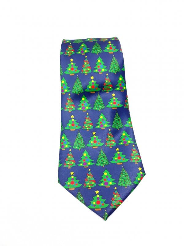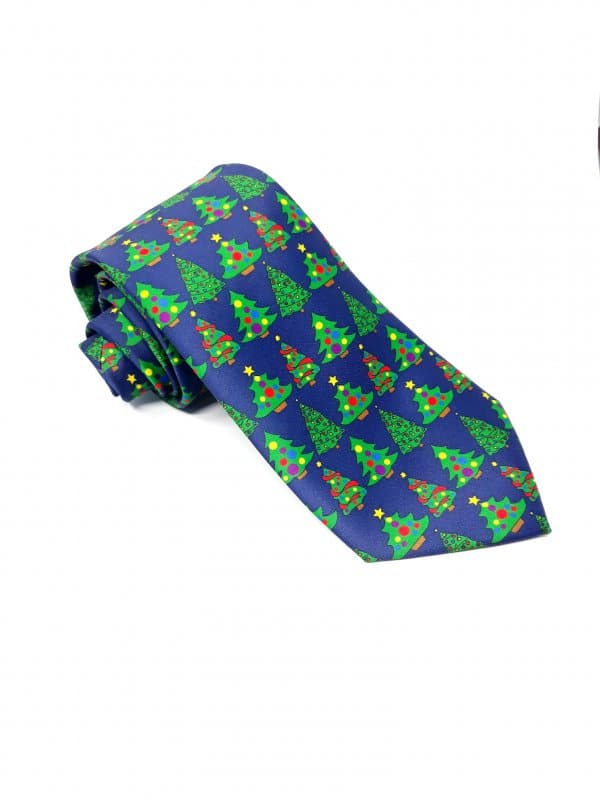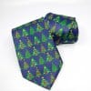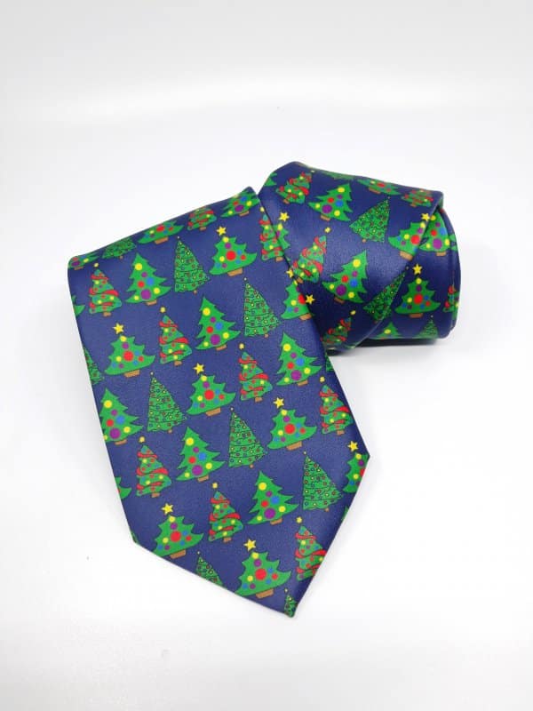 Świąteczny elegancki krawat męski w ciekawy wzór kolorowych choinek na granatowym tle.