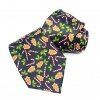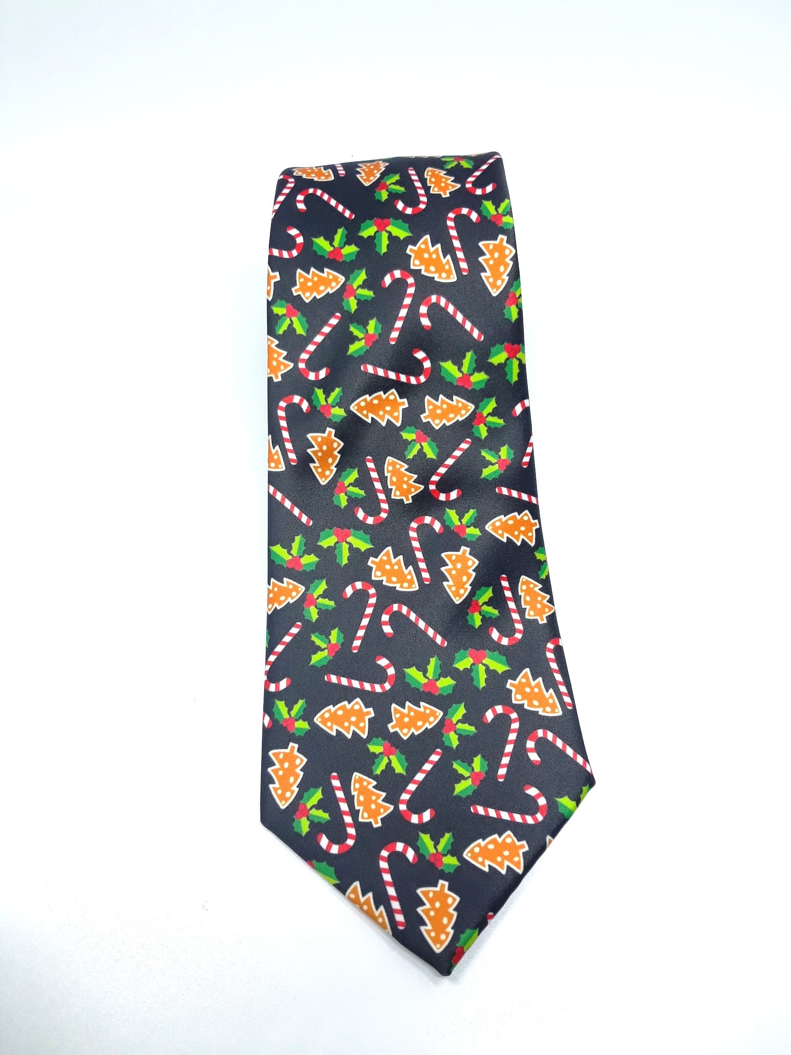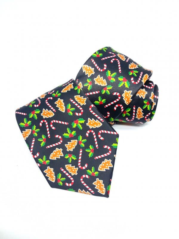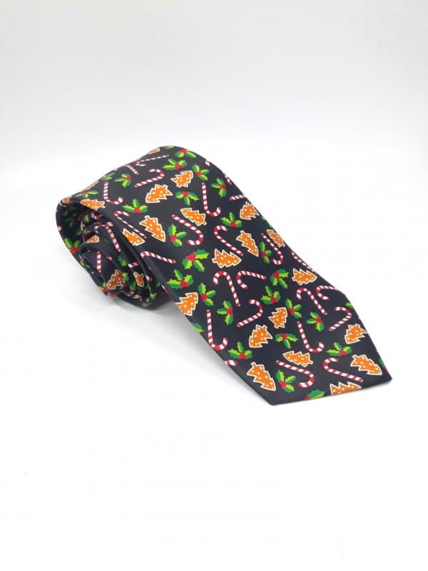 Świąteczny elegancki krawat męski w ciekawy wzór pierniczków i cukierków na czarnym tle.
