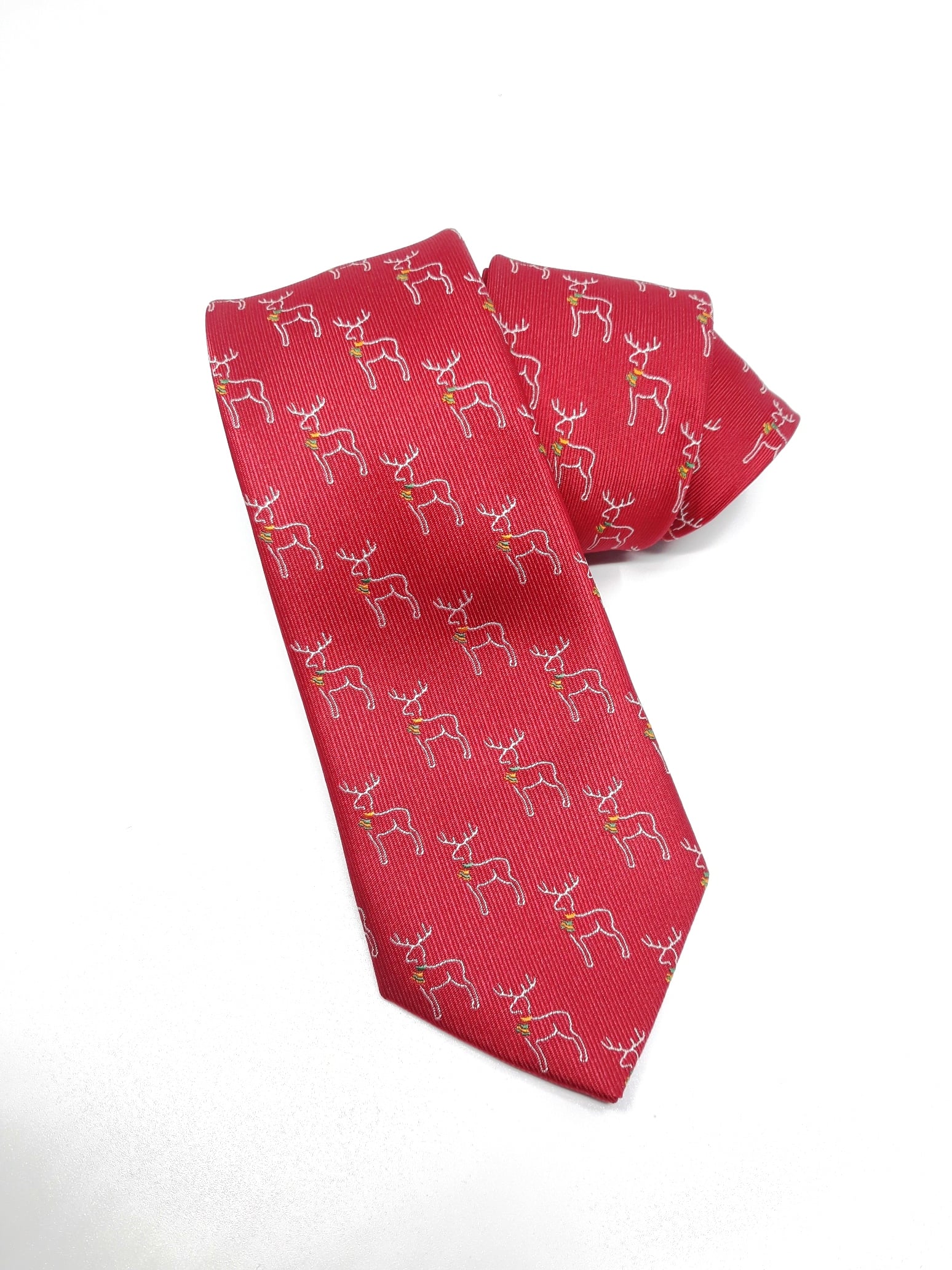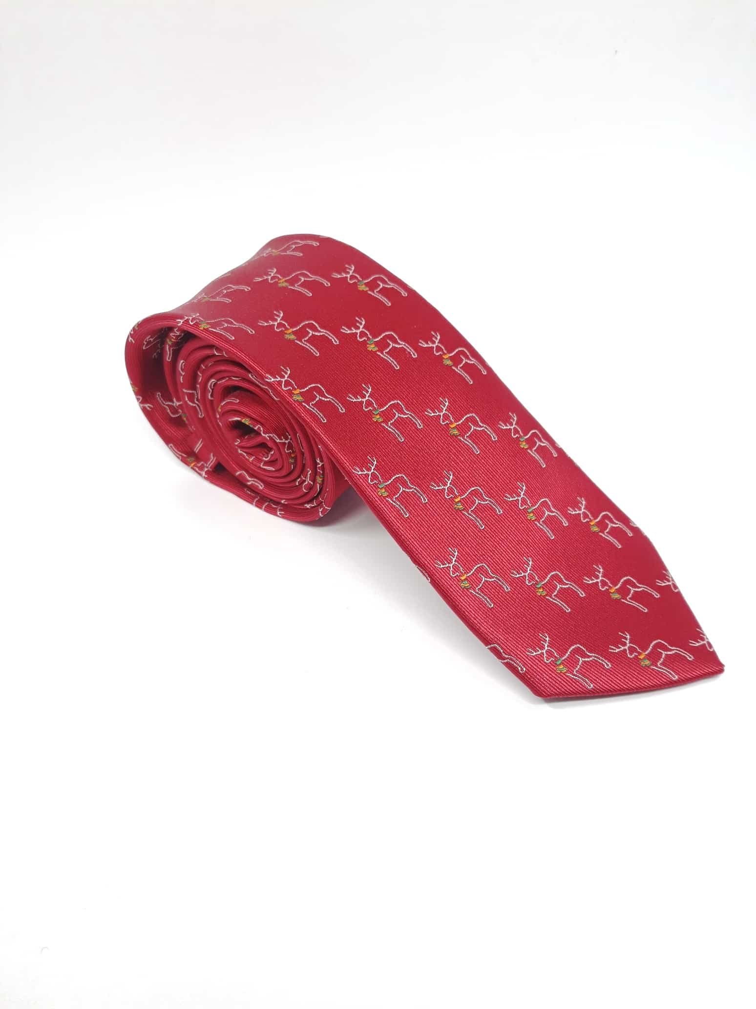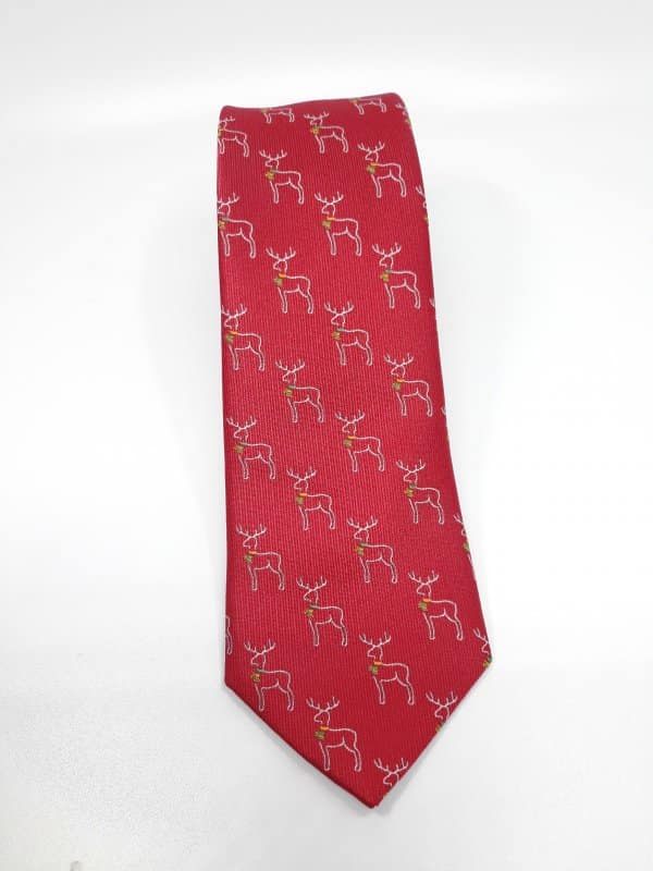 Świąteczny elegancki krawat męski w ciekawy wzór reniferów na czerwonym tle.