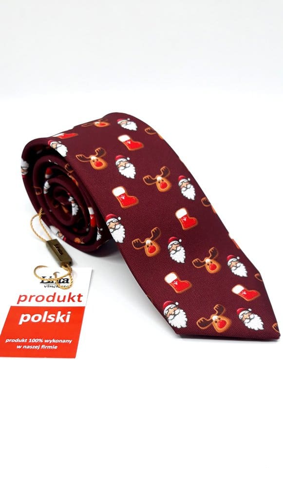 Świąteczny elegancki krawat męski w ciekawy wzór reniferów, Mikołajów oraz skarpet świątecznych.