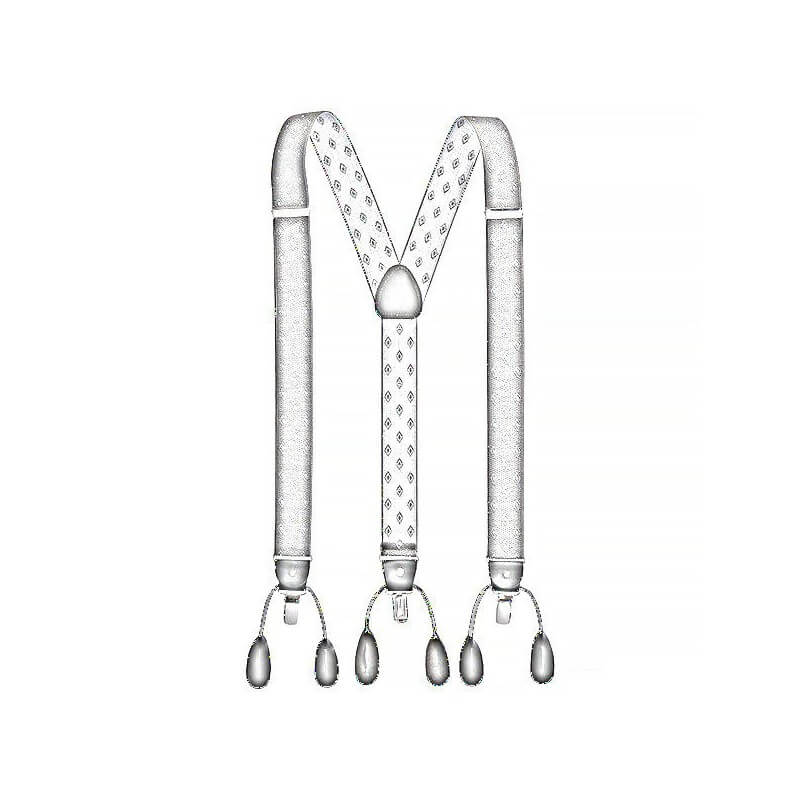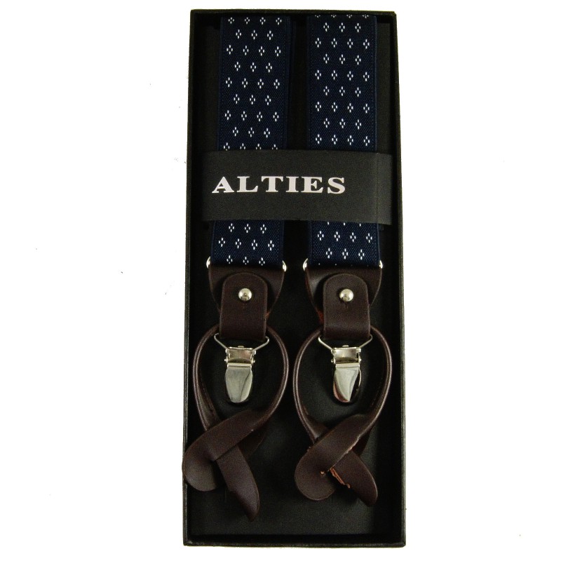 Męskie ekskluzywne szelki renomowanej firmy Alties Granatowe w białe kropeczki. Przede wszystkim zapinane na dwa sposoby. Klasycznie na srebrną klamrę oraz na guziki za pomocą skórzanych zapinek.