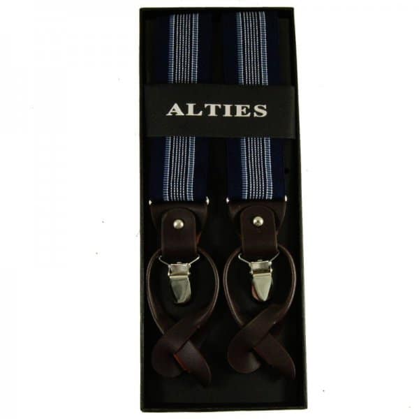Męskie ekskluzywne szelki renomowanej firmy Alties granatowo niebieskie. Przede wszystkim zapinane na dwa sposoby. Klasycznie na srebrną klamrę oraz na guziki za pomocą skórzanych zapinek.