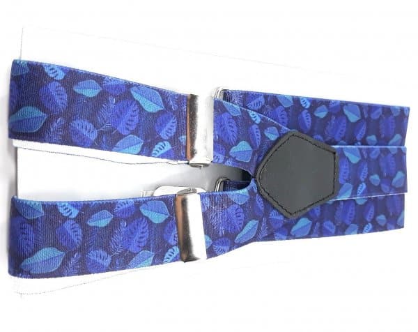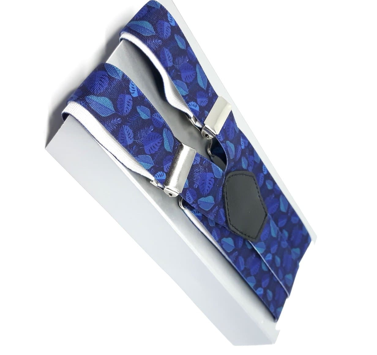 Szelki męskie to produkt trwały,starannie wykonany.Dostępny w kolorze granatowym w liście. Są płynnie regulowane bardzo mocnymi klamrami.Trzy paski połączone są kolorystycznie dobraną łatką skórzaną. Idealne dla mężczyzny każdego wzrostu. Wykonane z miękkiej gumy która super się naciąga i jest wygodna.