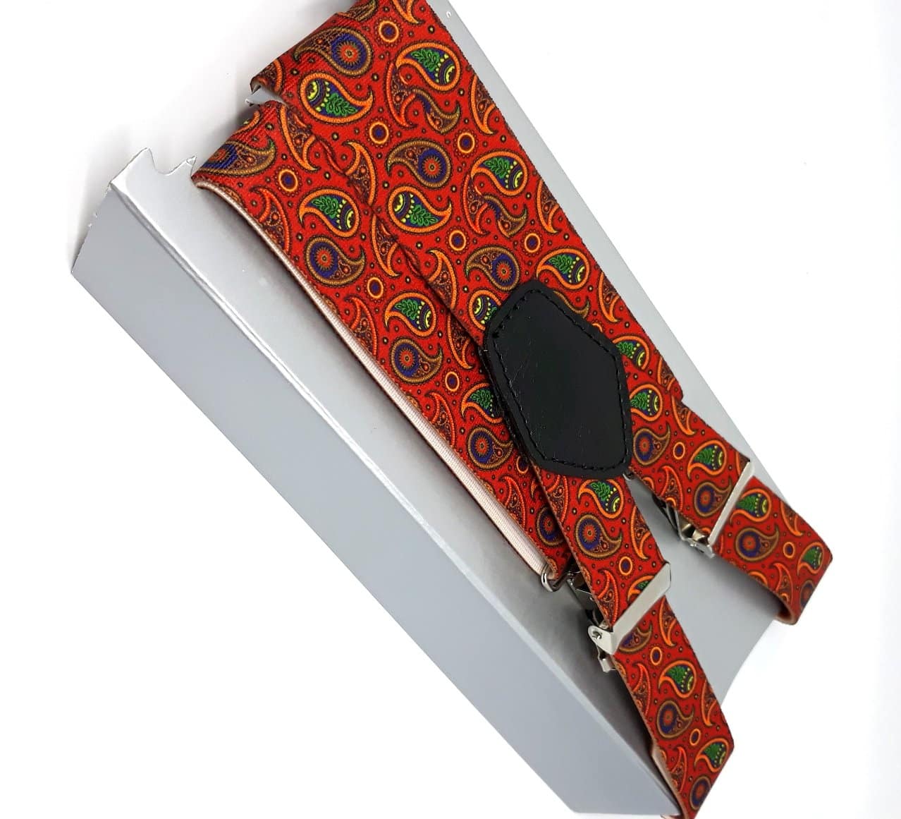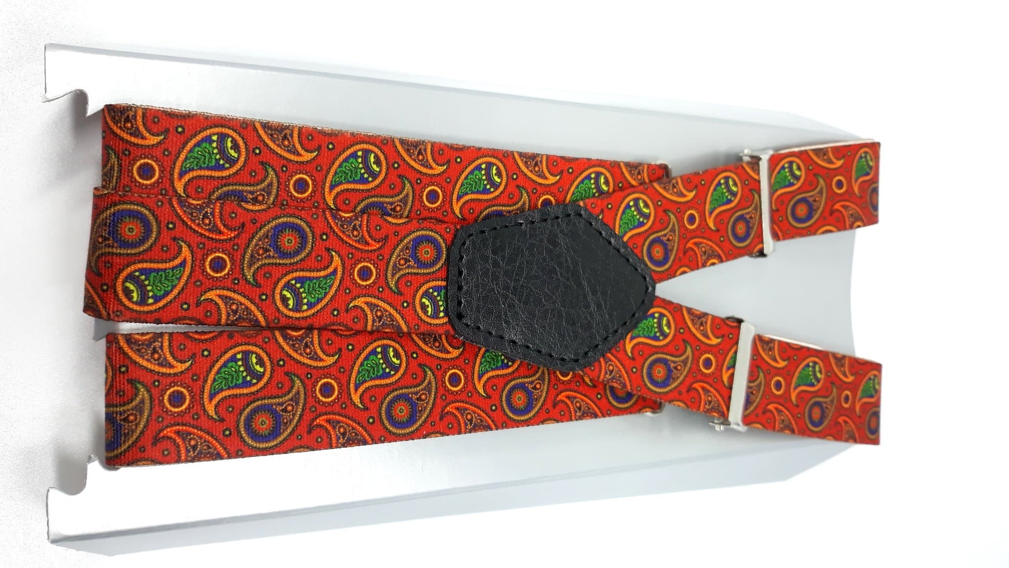 Szelki męskie to produkt trwały,starannie wykonany.Dostępny w kolorze rudym w wzory tureckie. Są płynnie regulowane bardzo mocnymi klamrami.Trzy paski połączone są kolorystycznie dobraną łatką skórzaną. Idealne dla mężczyzny każdego wzrostu. Wykonane z miękkiej gumy która super się naciąga i jest wygodna.