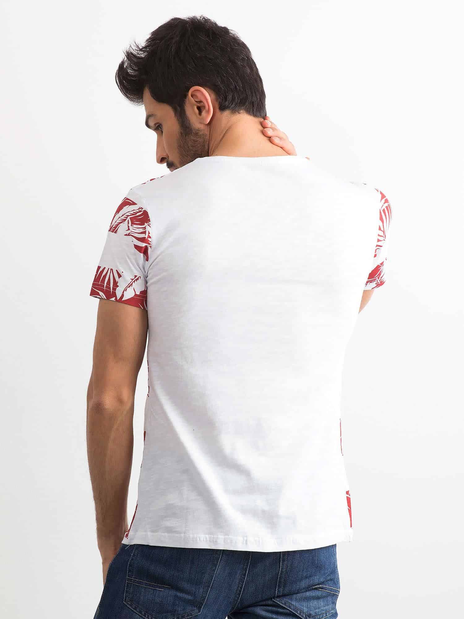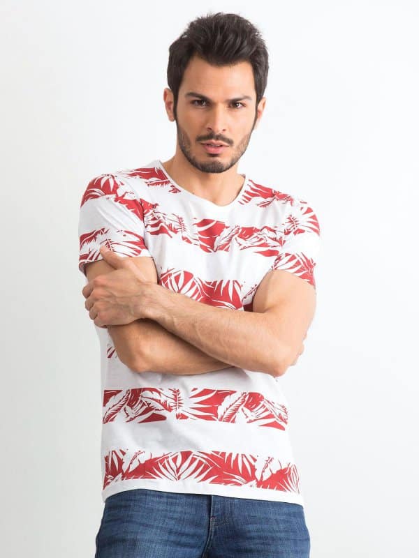 T-shirt Bawełniany Biały Bordowe Liście to oryginalna propozycja , która z pewnością przypadnie do gustu każdemu modnie ubranemu mężczyźnie. Wzór T-shirta fantastycznie nawiązuje do motywu marynarskiego. Męska koszulka z krótkim rękawem dobrze dopasowana do kształtu ciała, dzięki czemu świetnie eksponuje wszystkie jego zalety. Posiada ciekawe pasy, nadające mu stylowy charakter. Wykonano go z bawełny, dzięki czemu jest miękki i przyjemny w dotyku.