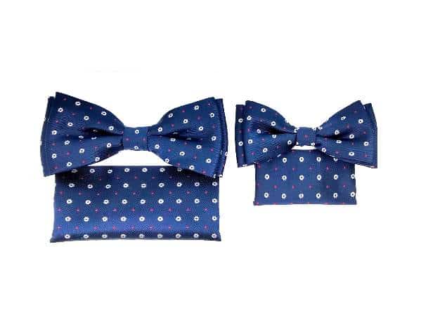 Unikatowy zestaw eleganckich much dla taty i syna, granatowe słoneczka wraz z poszetkami. Mucha to dodatek, który stanowi bazę garderoby eleganckiego mężczyzny. Zgodnie z płynącym obecnie trendy modowym nie ma obowiązku, który mówiłby o łączenia jej z frakiem czy kołnierzykiem łamanym przy koszuli. Moda nowoczesna zestawia muchę nie tylko ze stylem eleganckim, ale również z luźnym i sportowym strojem. Niebanalna mucha orzeźwi tradycyjny garnitur, jak również wyśmienicie będzie się komponować ze sportową marynarką czy luźnym kardiganem.