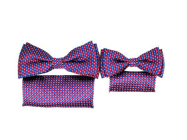 Unikatowy zestaw eleganckich much dla taty i syna, niebiesko czerwone we wzorek wraz z poszetkami. Mucha to dodatek, który stanowi bazę garderoby eleganckiego mężczyzny. Zgodnie z płynącym obecnie trendy modowym nie ma obowiązku, który mówiłby o łączenia jej z frakiem czy kołnierzykiem łamanym przy koszuli. Moda nowoczesna zestawia muchę nie tylko ze stylem eleganckim, ale również z luźnym i sportowym strojem. Niebanalna mucha orzeźwi tradycyjny garnitur, jak również wyśmienicie będzie się komponować ze sportową marynarką czy luźnym kardiganem.
