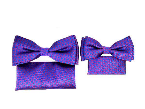 Unikatowy zestaw eleganckich much dla taty i syna, szafirowe w czerwony wzór wraz z poszetkami. Mucha to dodatek, który stanowi bazę garderoby eleganckiego mężczyzny. Zgodnie z płynącym obecnie trendy modowym nie ma obowiązku, który mówiłby o łączenia jej z frakiem czy kołnierzykiem łamanym przy koszuli. Moda nowoczesna zestawia muchę nie tylko ze stylem eleganckim, ale również z luźnym i sportowym strojem. Niebanalna mucha orzeźwi tradycyjny garnitur, jak również wyśmienicie będzie się komponować ze sportową marynarką czy luźnym kardiganem.