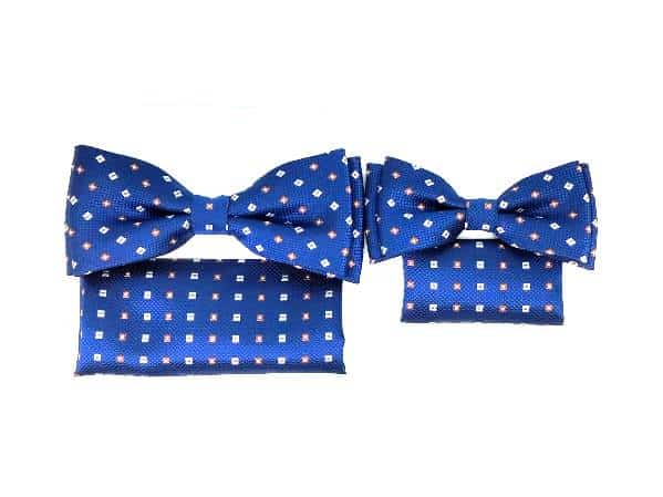 Unikatowy zestaw eleganckich much tata i syn, granat w kwadraty wraz z poszetkami. Mucha to dodatek, który stanowi bazę garderoby eleganckiego mężczyzny. Zgodnie z płynącym obecnie trendy modowym nie ma obowiązku, który mówiłby o łączenia jej z frakiem czy kołnierzykiem łamanym przy koszuli. Moda nowoczesna zestawia muchę nie tylko ze stylem eleganckim, ale również z luźnym i sportowym strojem. Niebanalna mucha orzeźwi tradycyjny garnitur, jak również wyśmienicie będzie się komponować ze sportową marynarką czy luźnym kardiganem.
