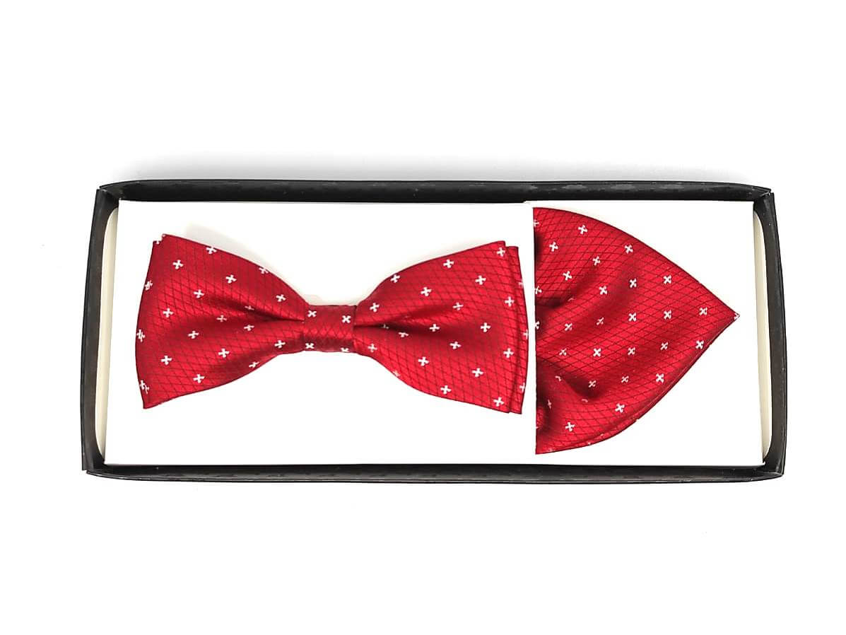 Mucha nie jest ręcznie wiązana lecz zawiązana na stałe. Pasek od muchy posiada regulację zapięcia. Komplet ten zawiera muchę wraz z poszetką widoczną na zdjęciu.