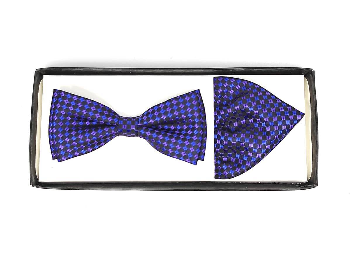 Zestaw mucha plus poszetka czarna w kwadraciki fioletowo niebieskie