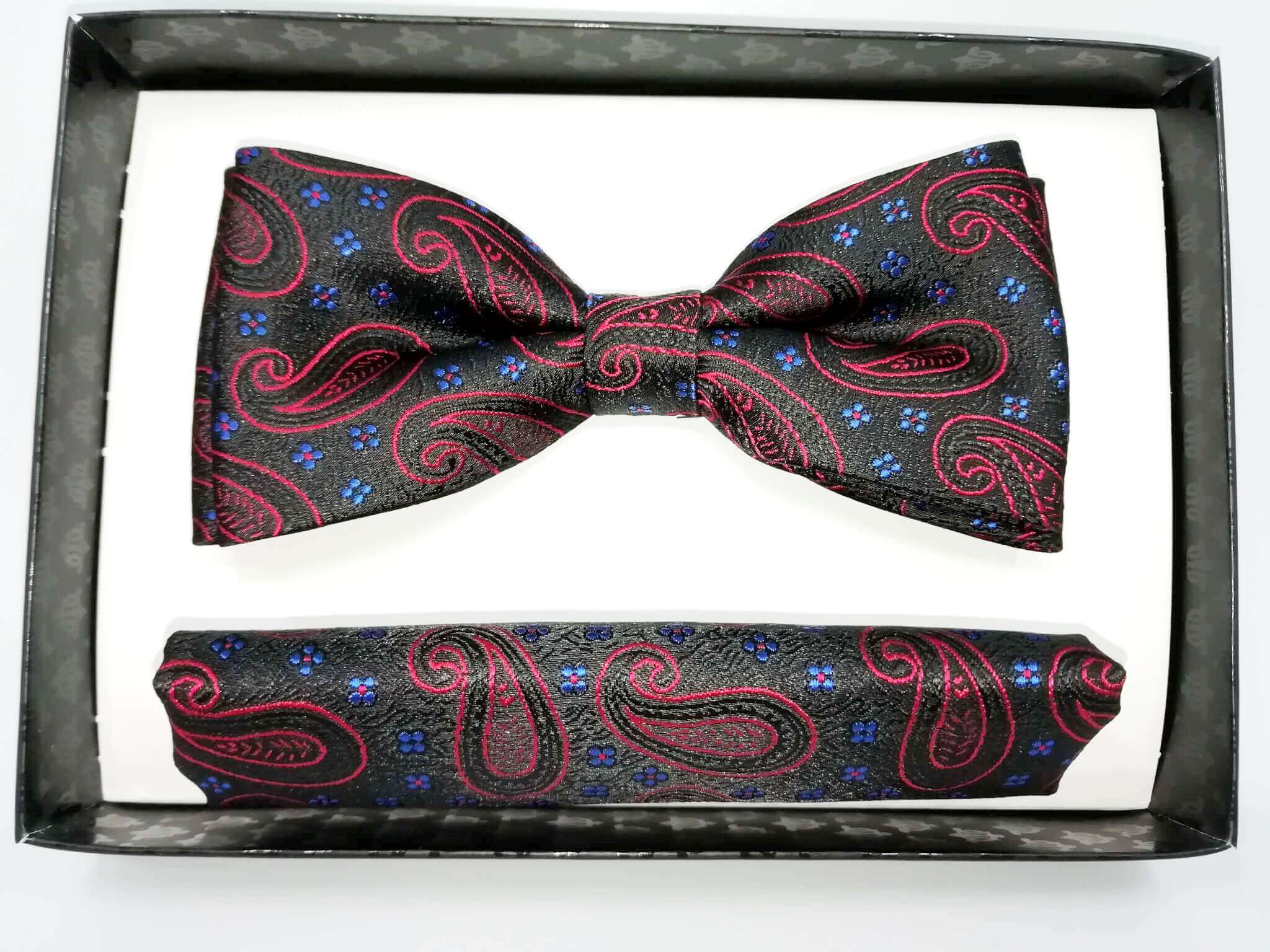 Zestaw mucha plus poszetka czarna wzór czerwony niebieskie kwiatki