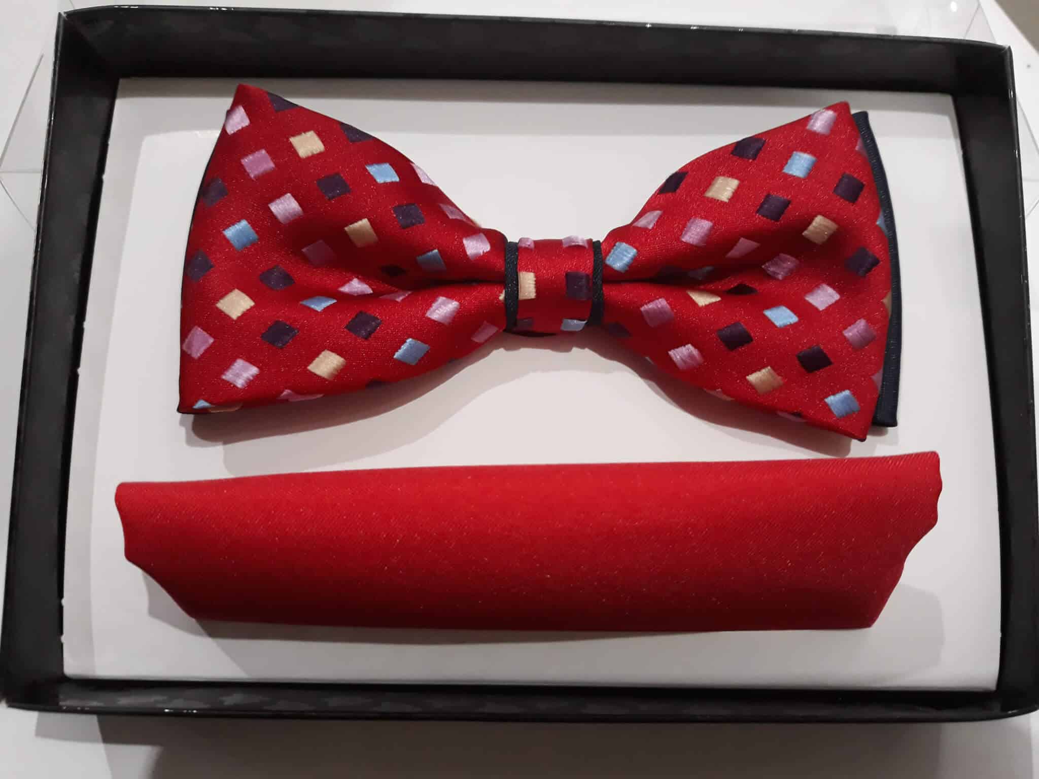 Mucha nie jest ręcznie wiązana lecz zawiązana na stałe. Pasek od muchy posiada regulację zapięcia. Komplet ten zawiera muchę wraz z poszetką widoczną na zdjęciu.