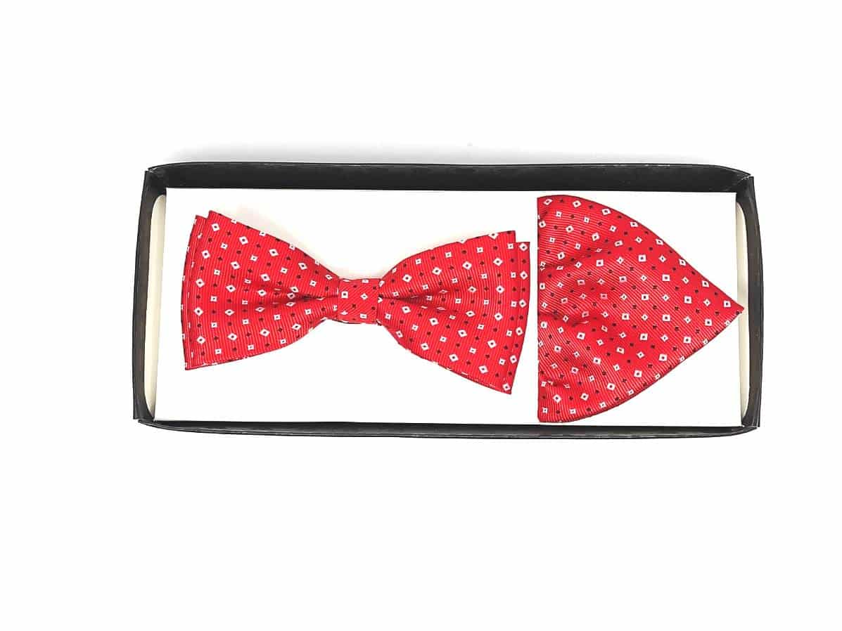 Mucha nie jest ręcznie wiązana lecz zawiązana na stałe. Pasek od muchy posiada regulację zapięcia. Komplet ten zawiera muchę wraz z poszetką widoczną na zdjęciu.