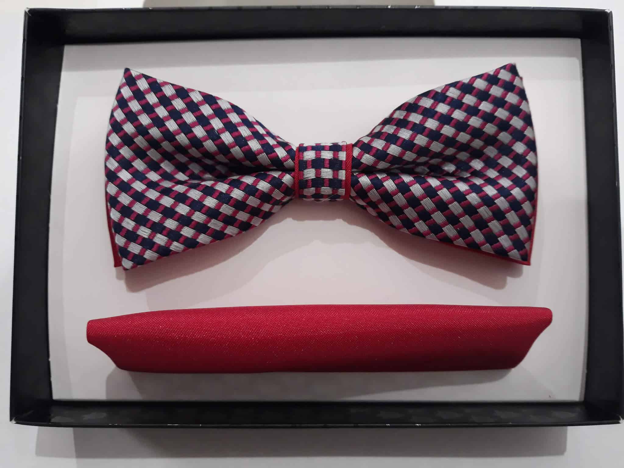 Mucha nie jest ręcznie wiązana lecz zawiązana na stałe. Pasek od muchy posiada regulację zapięcia. Komplet ten zawiera muchę wraz z poszetką widoczną na zdjęciu.