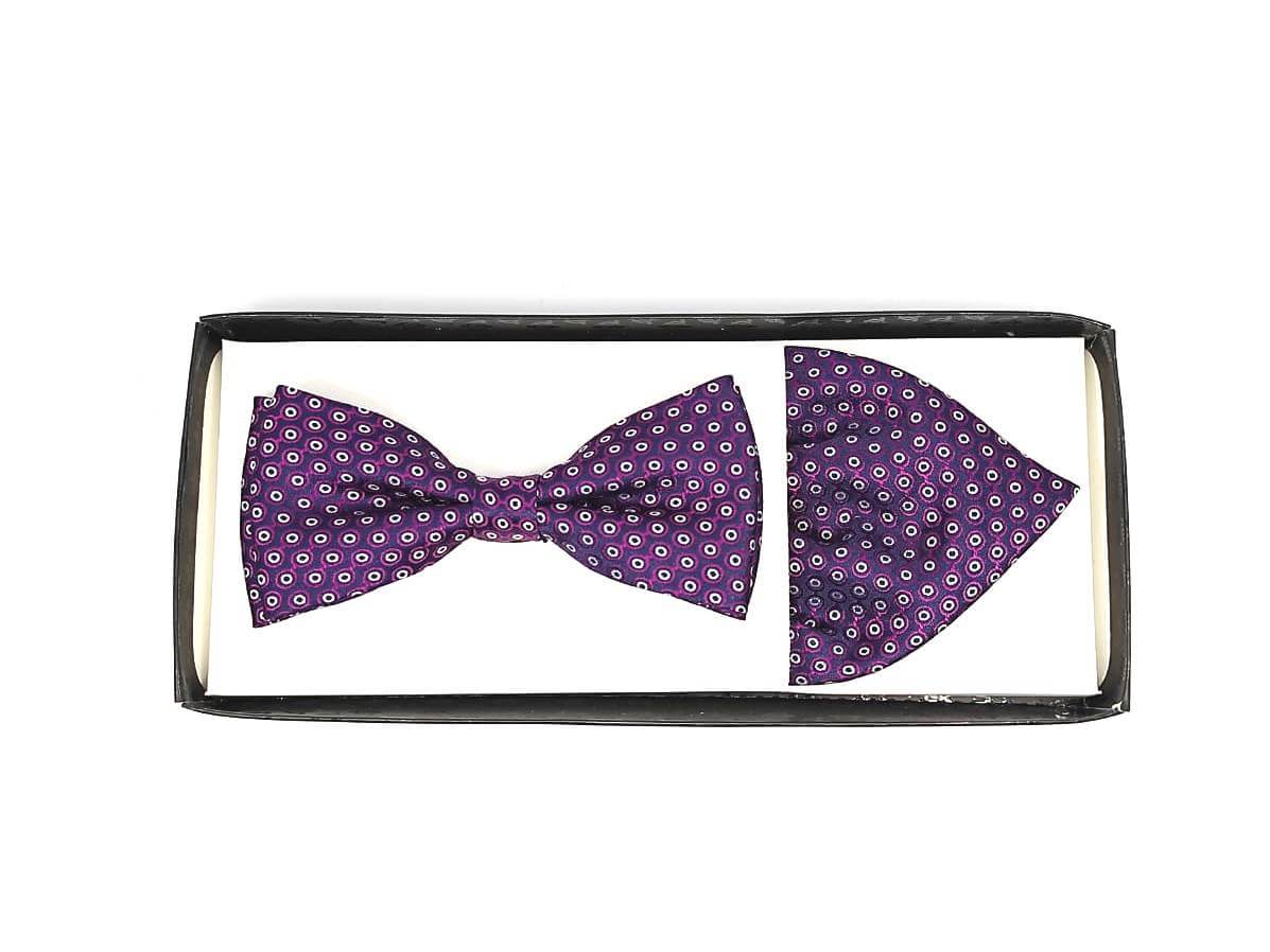 Zestaw mucha plus poszetka granatowo fioletowa. Mucha to dodatek, który stanowi bazę garderoby eleganckiego mężczyzny. Zgodnie z płynącym obecnie trendy modowym nie ma obowiązku, który mówiłby o łączeniu jej z frakiem czy kołnierzykiem łamanym przy koszuli. Moda nowoczesna zestawia muchę nie tylko ze stylem eleganckim, ale również z luźnym i sportowym strojem. Niebanalna mucha orzeźwi tradycyjny garnitur, jak również wyśmienicie będzie się komponować ze sportową marynarką czy luźnym kardiganem.