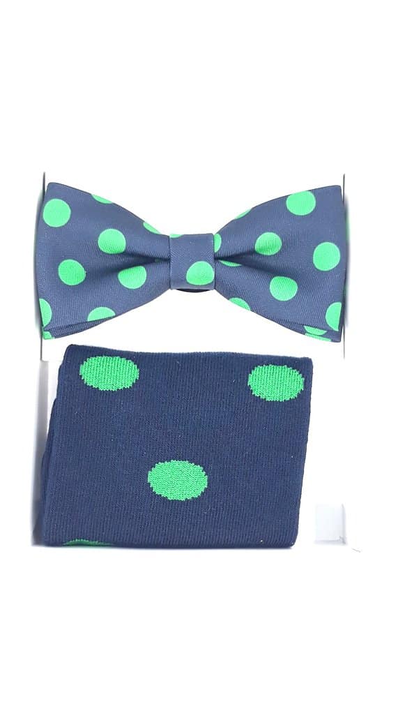 Unikatowy zestaw mucha skarpety ze wzorem w zielone kropki.